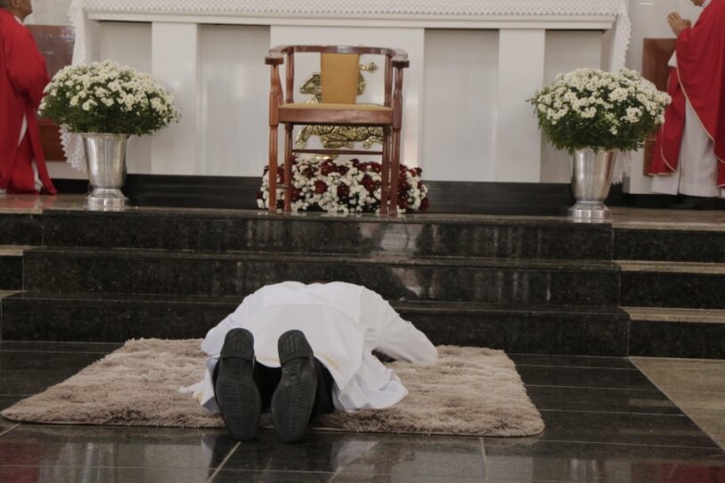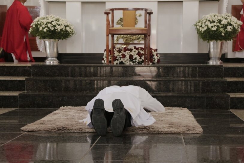 Após a homilia Dom Juarez Delorto Secco interrogou o candidato ao diaconato, manifestando sua livre decisão e abertura de coração para receber a Sagrada Ordem. Por conseguinte, simbolizando sua consagração total a Cristo, à Igreja e ao Evangelho, os ordenado prostrou-se no chão enquanto toda a comunidade rezava por eles, o Seminarista Jarbas Antônio entoou a Ladainha de todos os santos.
